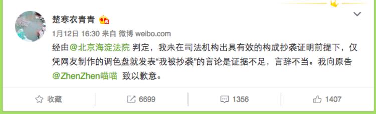 4 月,楚寒衣青突然接到法院传票,发现自己被游戏作者喵喵控告“侵犯名誉权”,后者要求其赔偿各项损失费 10 万元人民币。12 月,法院判楚寒衣青败诉,需支付 1.5 万元赔偿并在微博予以公开道歉。因此在今年 1 月 12 日,楚寒衣青发布了这条微博:经由 @北京海淀法院判定,我未在司法机构出具有效的构成抄袭证明前提下,仅凭网友制作的调色盘就发表“我被抄袭”的言论是证据不足,措辞不当,我向原告 @ZhenZhen喵喵 致以歉意。