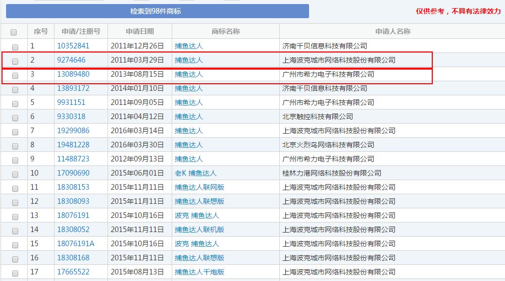 以“捕鱼达人”第41类商标为例,波克城市于2011年3月29日申请注册,2012年3月12日,希力电子对该申请注册商标提出异议。2013年5月28日,国家商标局裁定希力电子异议理由不成立,争议商标予以核准注册。