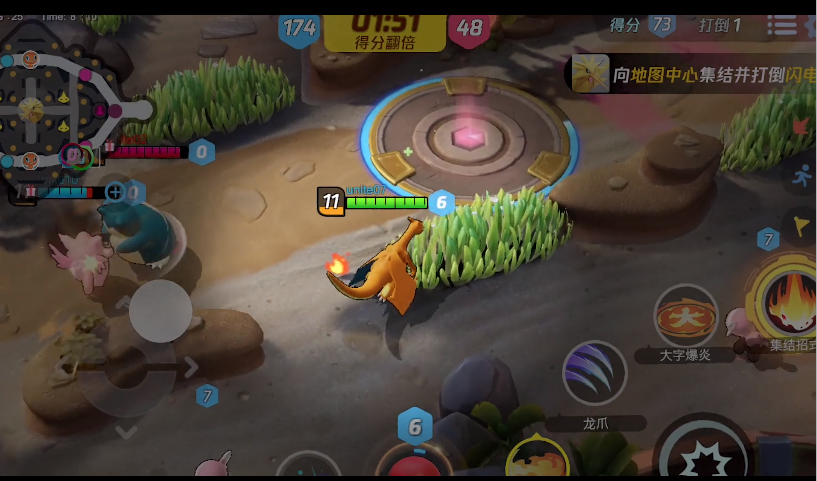 令人诧异的是,游戏采用了MOBA的对战方式,从演示的效果和UI来看,游戏接近于《英雄联盟》或者《风暴英雄》。在胜负条件上,又有别于传统的推塔机制,需要双方团队争夺地图中的得分点,也就是“野生宝可梦”,推至对手基地,即可抢下分数,最终通过分数高低来决定整局胜负。