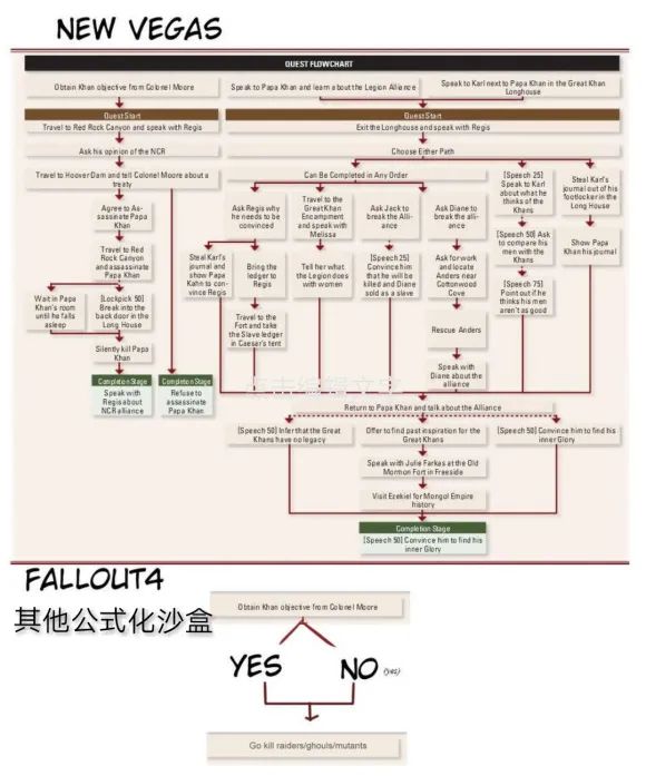 在游戏作品中,谈到网状叙事就离不开黑曜石的《辐射:新维加斯》,玩家空降到一个巨大阴谋的齿轮上,涉及到整个世界的历史和各个势力集团。搞清这一切,主线任务有明确的目的,但没有明确的过程,玩家每次可以通过突破一些角色的口风,来了解到阴谋的冰山一角,当然也可以在浑然不知的情况下得到一个傻人有傻福的结局。执意探究真相的玩家,通过多周目的游玩,可以逐渐了解到每个环节的因果,也对应上游戏丰富的角色自定义玩法。