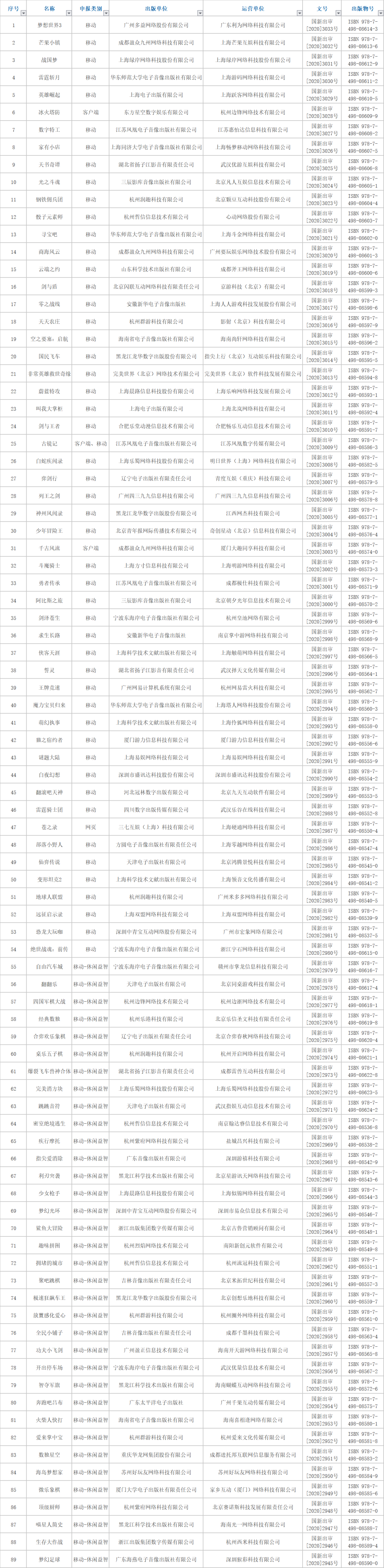 在此次89款过审名单中,移动游戏高达50款,移动-休闲益智35款,客户端游戏2款,网页游戏1款,以及1款客户端+移动游戏。