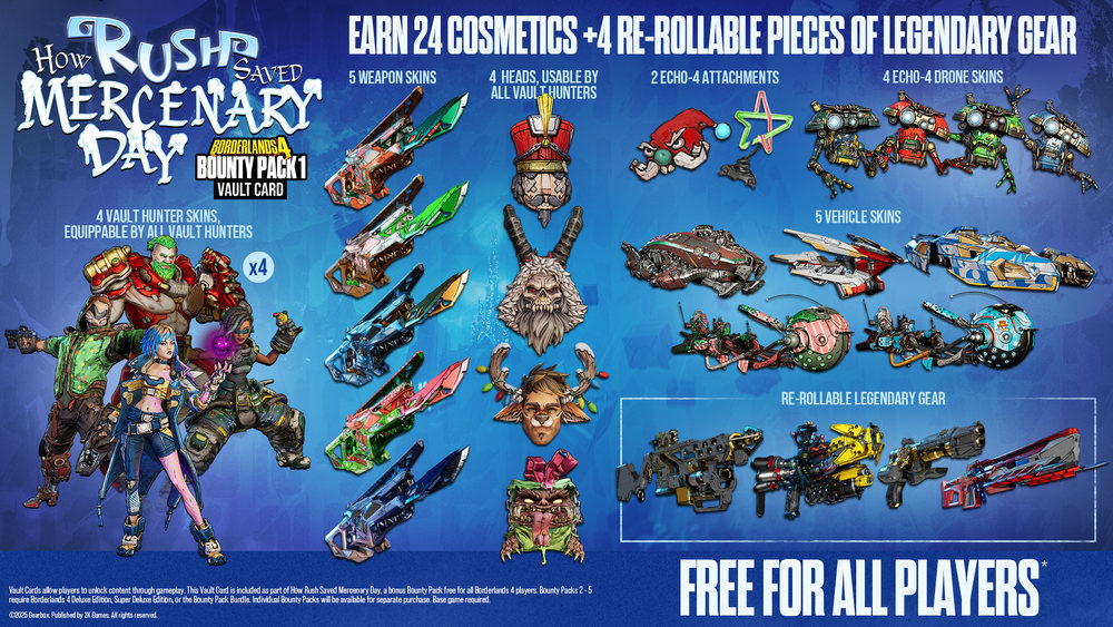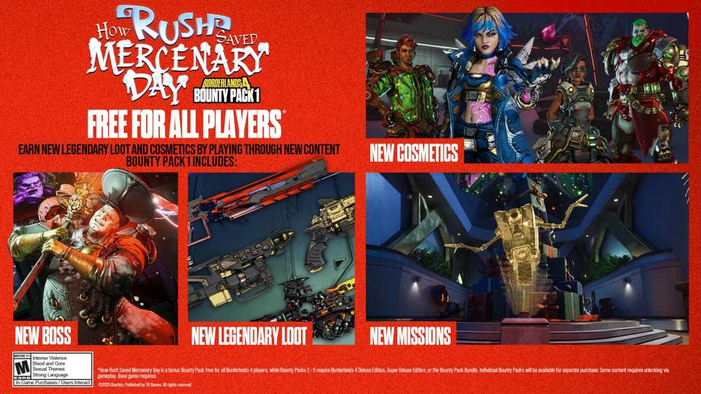 除了将首个赏金包免费提供外,2K 和 Gearbox 还将额外增加一个全新的、第五个赏金包,这意味着玩家可以在未来一年里期待凯洛斯星上更多的狂欢。已购买赏金包捆绑包的玩家,将可免费获取新增的第五个赏金包。豪华版、超级豪华版或赏金包捆绑包的所有者仍将照常获得四个付费悬赏包(悬赏包2、3、4和5),而现在所有玩家均可免费获得首个赏金包。* 关于更多未来赏金包发布时间与内容的详情,将在后续公布。