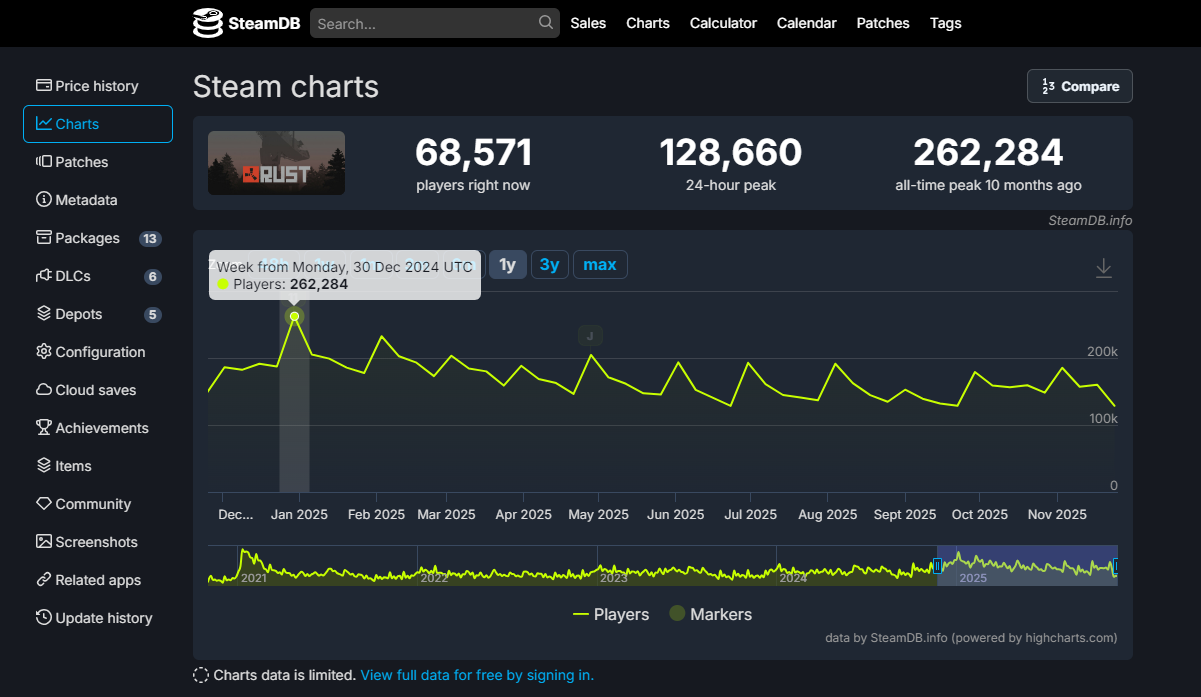 更令人惊叹的是,即便在发布十余年后,《Rust》在Steam平台上的同时在线玩家峰值仍能长期保持在15万左右,甚至在今年初曾创下超过26万的同时在线新纪录。充分证明了其核心玩法所拥有的持久魅力与社区活力。