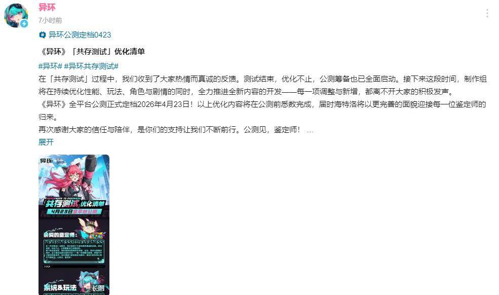 2月26日,完美世界旗下的超自然都市开放世界游戏《异环》在各大平台官宣,其全平台公测正式定档2026年4月23日,届时将同步上线PC、安卓、iOS、Mac、鸿蒙、PlayStation®5等平台。