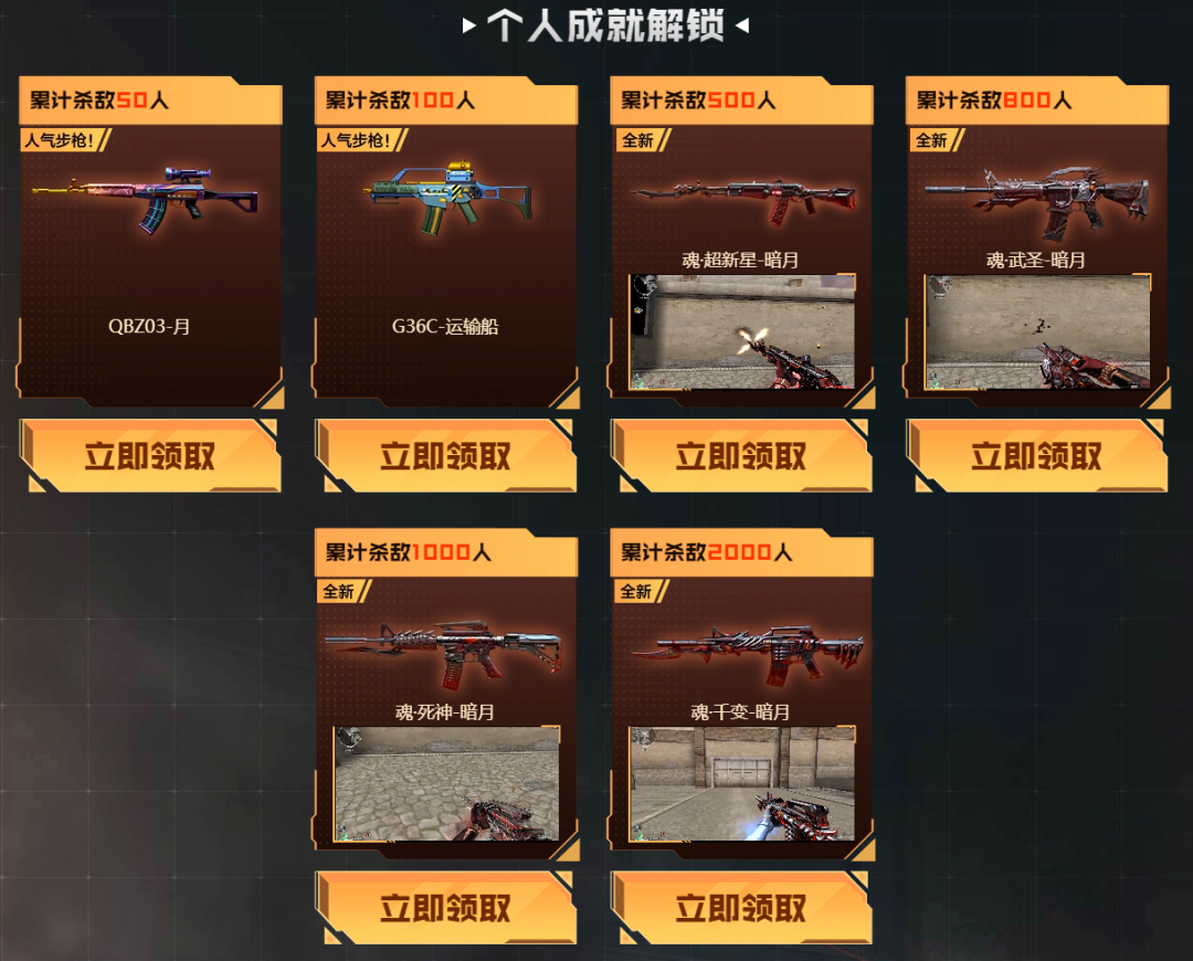 3月12日至4月19日,玩家达成累计杀敌数量任务,即可逐步解锁魂·千变-暗月、魂·死神-暗月、魂·武圣-暗月、魂·超新星-暗月以及G36C-运输船、QBZ03-月等武器。这是一条面向所有玩家的长线福利,门槛不高,重在积累。
