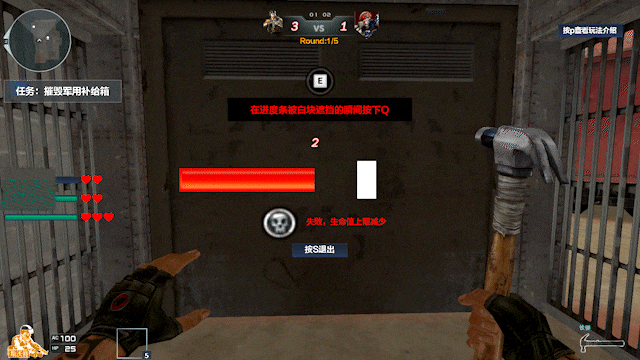 囚犯方的任务逻辑则更为丰富:首要目标是躲避追捕的同时,用手中的铁锤破坏地图中的军用补给箱。破坏3处后即可解锁武器库,拾取强力武器反杀狱警。当被关入牢房时,需要通过撬锁逃亡,撬锁失败会减少生命值上限。未被抓住的囚犯也可以通过长时间按键交互救出队友——这构成了完整的“逃脱方策略链条”。