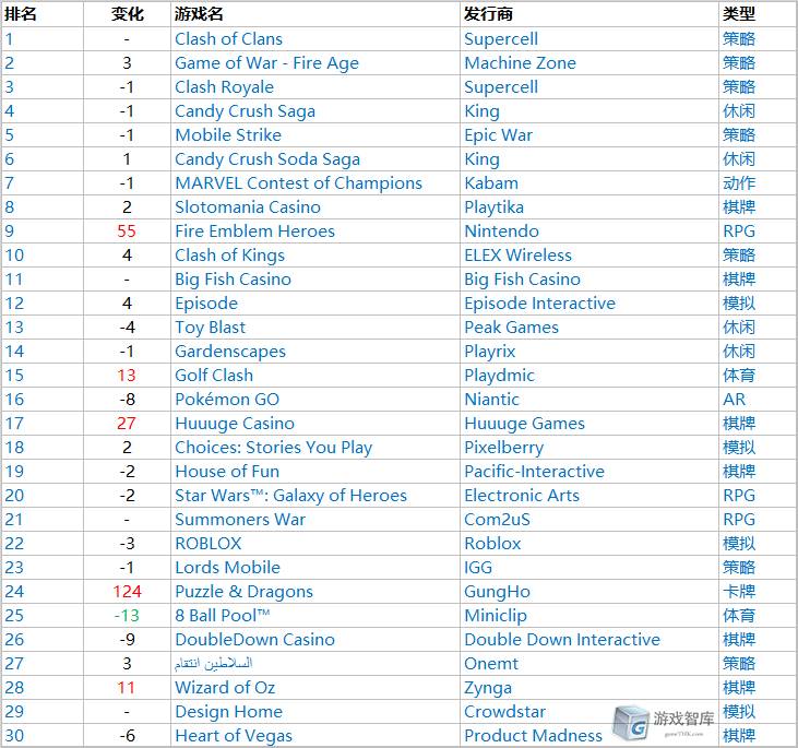 十名开外榜单看点,首要在于任天堂嫡系《火焰纹章英雄》突然发力,从5、60名的化外之地杀回,与庶出的Pokémon GO大幅滑落形成鲜明对比。主要得益于更新活动的强劲,让《火焰纹章英雄》来势汹汹。
