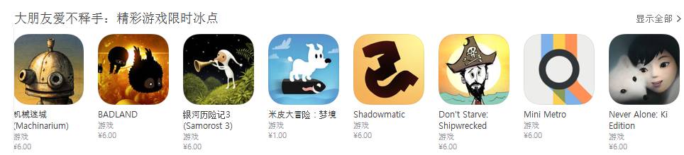 本周的付费榜则涌现了一大波经典付费游戏,相当少见的态势,不愧是六一专题折扣的功劳,其中大部分都是非常经典知名的独立游戏,且原价都不便宜,也有诸如《迷失岛》、《昔:Yesterday》、《永无止境》、《雨纪》这类国产独立游戏,不过《机械迷城》、《BADLAND》这类游戏的专题上镜率确实是高到离谱了,该剁手的玩家也早就剁手了,也不知道AppStore是否会出现如同Steam喜加一那样的一天,但那也许需要更多优质内容的加入。