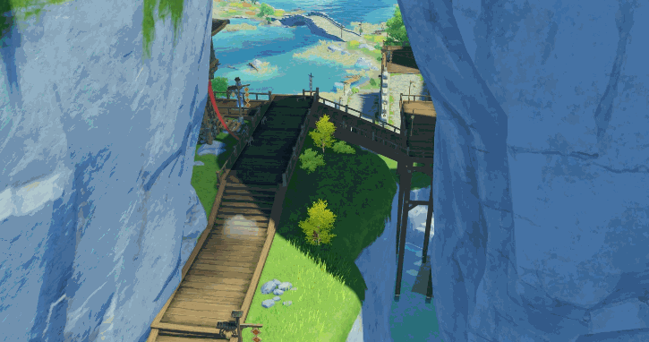场景叙事是展现文化细节的主要手段。作为连接起璃月和蒙德漫长通路的桥梁,制作组在其上放置了一个极具中国特色的建筑——望舒客栈。单是这个名字就已经让人感受到氛围的变化,客栈自不待言,提供一路上的旅人商贾出行保障,“望舒”则是古代对月亮的代称,暗合“璃月”,命名上的比兴手法,就是文化细节。建筑的设计风格来源于凤凰古城的吊脚楼,是桂林等西南地区很常见的建筑样式,而荻花洲野外芦苇浅滩的地形,也是东方美学和戏剧张力的结合。