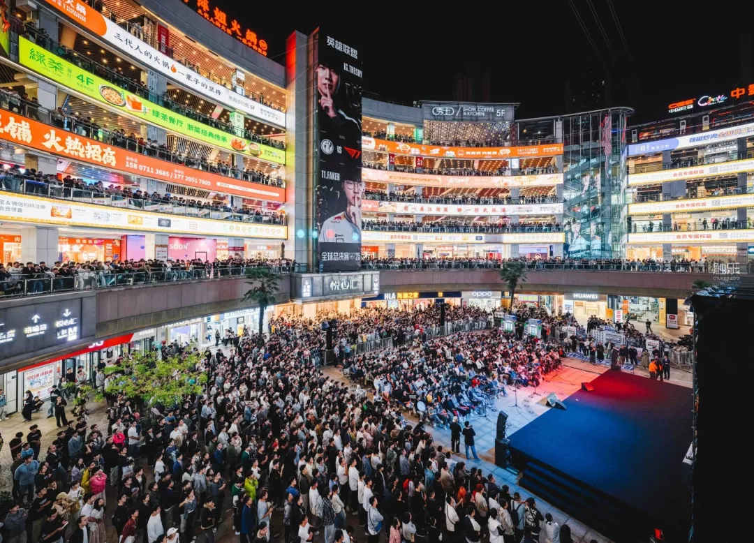 10月14日,2025《英雄联盟》全球总决赛开赛,光谷步行街迎来了首个观赛高峰。从午后开始,人流不断向喷泉广场汇集,最终在巨型LED屏幕下形成一片望不到边际的人海。所有毗邻的街道、楼梯甚至远处的天桥,都站满了人。