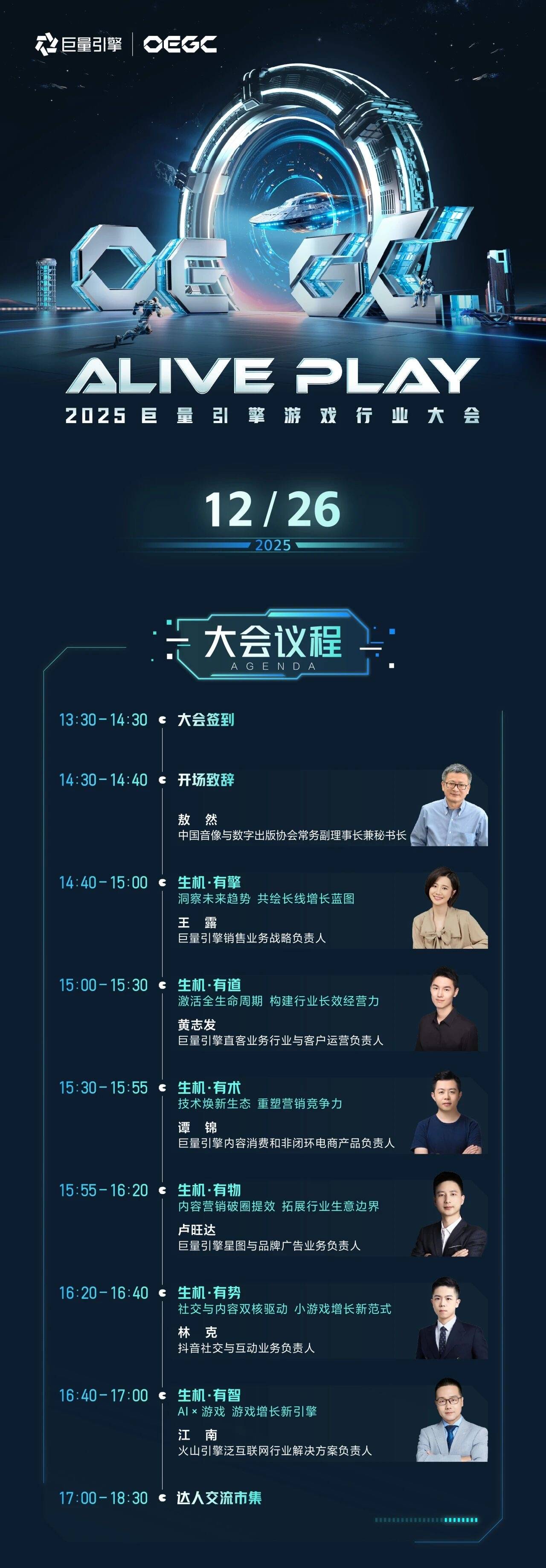 2026即将开启,行业共同关注的重点已转向如何基于现有坚实基础,实现长期高质量发展。在此背景下,2025巨量引擎 OEGC大会以“ALIVE PLAY”之名,聚集行业一线厂商、标志性产品和多元内容创作者,聚焦“长效经营”,为游戏厂商带来破圈增长新动力,为2026年游戏行业的发展开拓新思路。