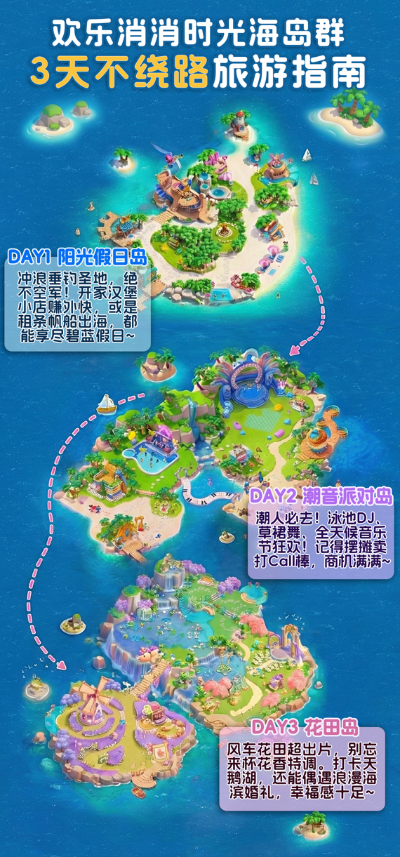 若说画面是门面,那么海岛旅行本身就是灵魂。这种对“第九艺术”的极致追求,将《欢乐消消时光》打磨成了一部可触碰的海岛旅行纪录片。无论是踏入花田岛的梦幻领地,还是徜徉在潮音岛的奇幻海岸,风格迥异的主题岛屿不仅是关卡的载体,更是情感的容器。