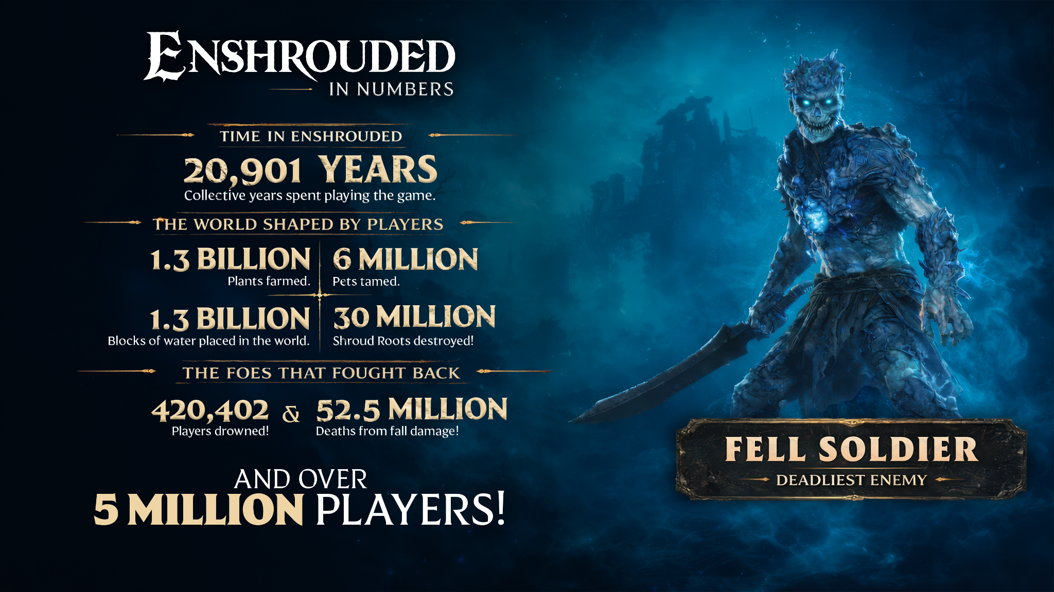 今日,Keen Games满怀激动(且带着一丝丝紧张)地告知各位:请期待2026年秋季《雾锁王国》正式版的发布。抢先体验开启后的爆发式成功,让团队有能力去执行并拓展《雾锁王国》最初的构想,而2026年下半年正是实现这一愿景的理想时机。1.0版本的发布并非终点,而是持续开发的全新篇章——后续还将有更多的优化、新增内容等。如果没有超过500万名玩家的支持,这段旅程绝无可能实现。开发团队再次向所有通过游戏、反馈和参与社区来添砖加瓦、添柴加火的火之子们致以诚挚的谢意。以下是收集到的一些令人惊叹的游戏数据: