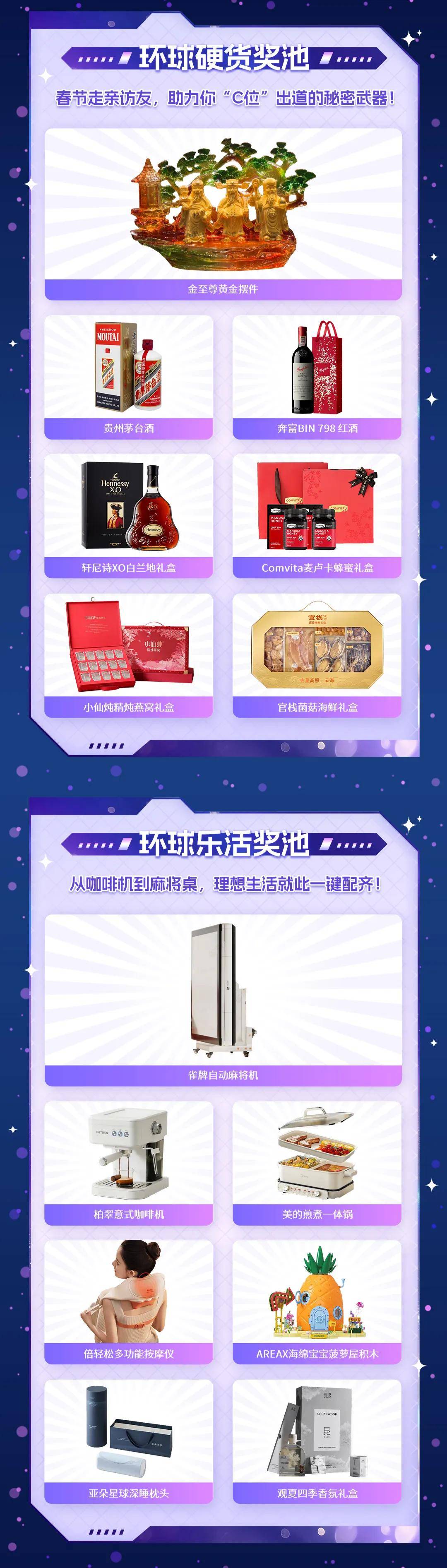 益世界年会是通过奖池来发放奖品的,其环球硬货奖池的大奖,是一个“金至尊黄金摆件”,谁拿到它2026年真是福气爆棚了,其他小奖也有贵州茅台、轩尼诗XO白兰地、海鲜礼盒、精炖燕窝等,不得不说这硬货确实拿得出手。有趣的是,益世界还在环球乐活奖池准备了“麻将机”。