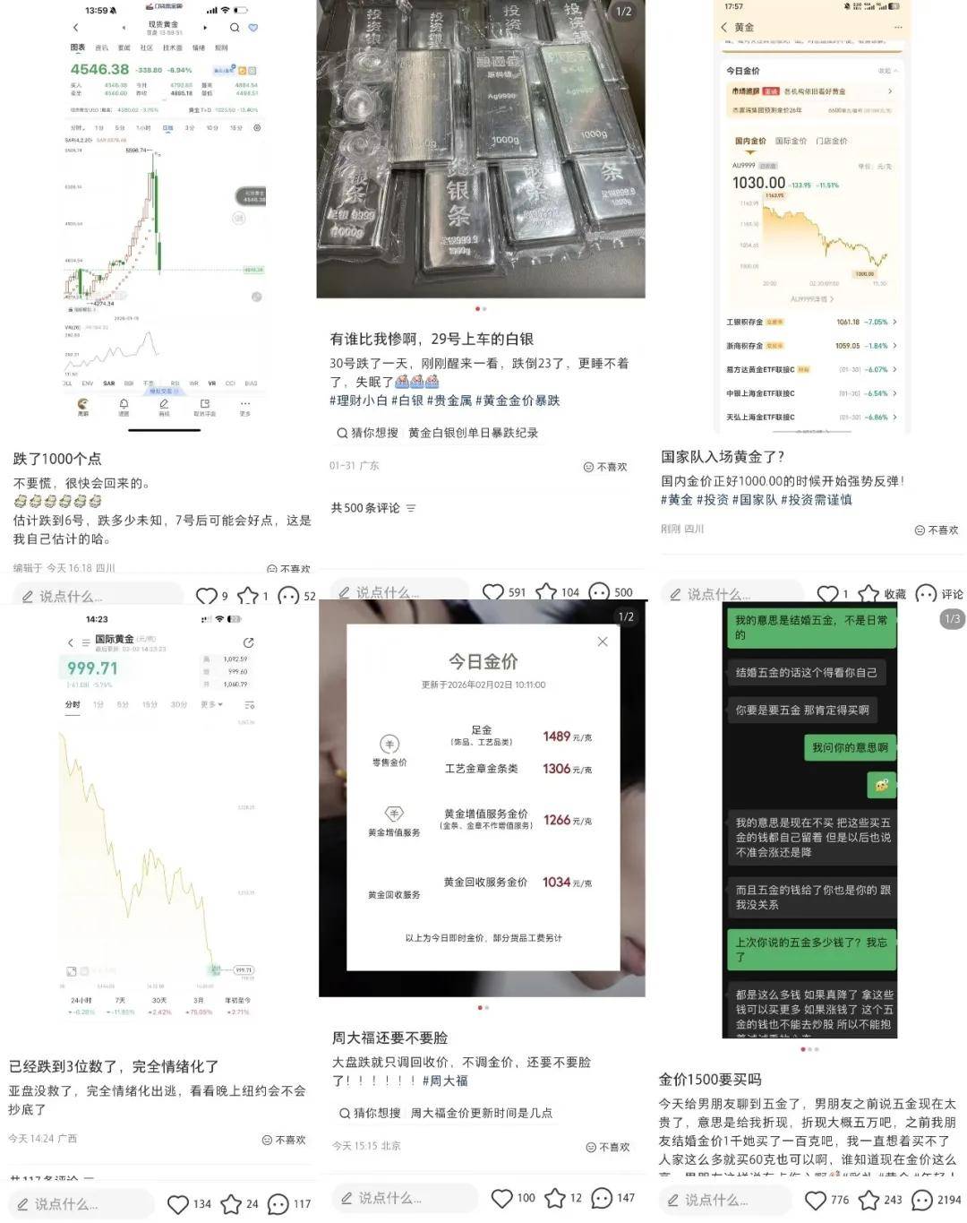 结合社媒上的发言可知,闷声发大财的人有很多,不过为此“交学费”,分享失败心得的人有更多。比如金价大幅震荡影响下,那些预测黄金会在今年涨到1克1500元、2000元,甚至3000元的人在上周跑步进场,想着早入早得利,奈何买在了山顶;也有前些年出手,买在山脚的人在纠结何时出货,可惜时机稍纵即逝,待到金价下行就只能想着涨回来的时候多赚一些;也有人踩着点,赶在商场开门时一个百米加速直冲金店拿货,几天之后冷静下来了,看到现货黄金价格降下来了,便与售货员开启退货拉扯。